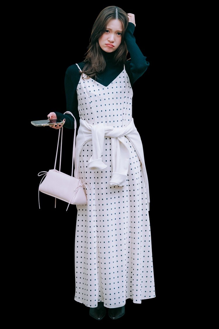 ドットワンピをロゴスエットでラフにハズして、肩の力が抜けた可愛さに♡ 仕上げはショートブーツで足元を引き締めれば、ゆるっとしててもだらしなく見えない“ちょうどいい”バランスが完成!