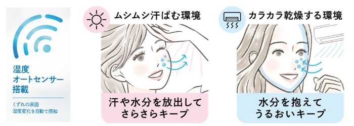「湿度オートセンサー」を搭載し、肌外部の湿度変化を自動で感知して水分量をコントロールします。