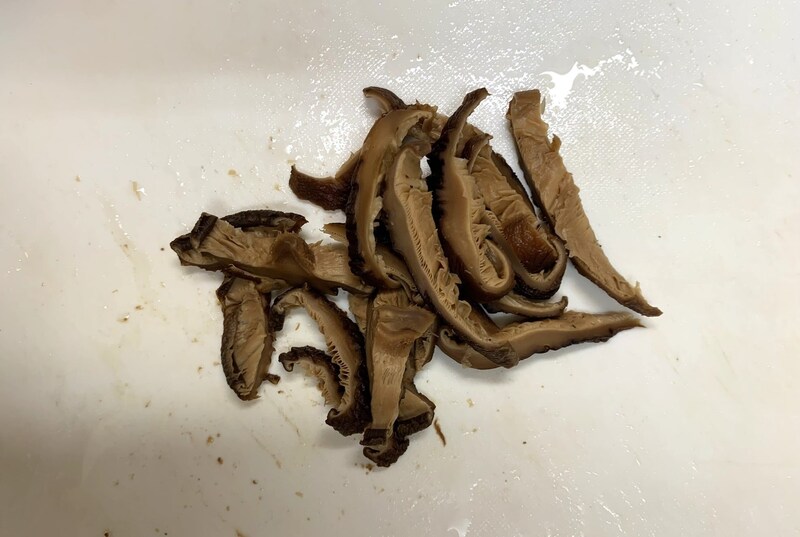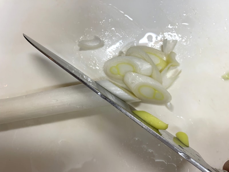戻した干し椎茸、白菜、ネギを切ります。白菜はそぎ切り、ネギは斜め切りにします。