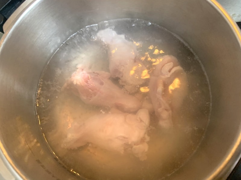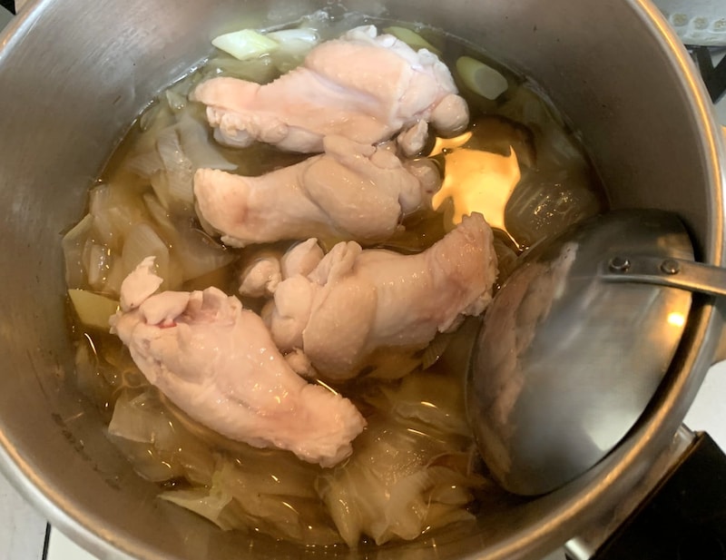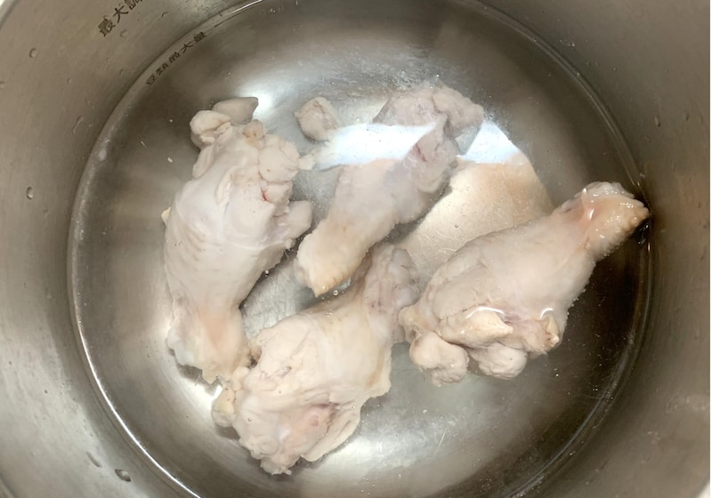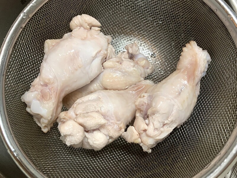 ①下準備です。鶏肉はサッと湯がいてから水に漬けて洗い、臭みのもとになる汚れを落とします(骨なし肉を使うならこの作業はいらないかも)。