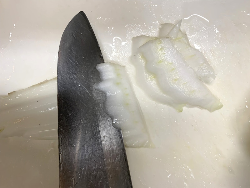①白菜はうま味をたっぷり引き出すためにそぎ切りにします。