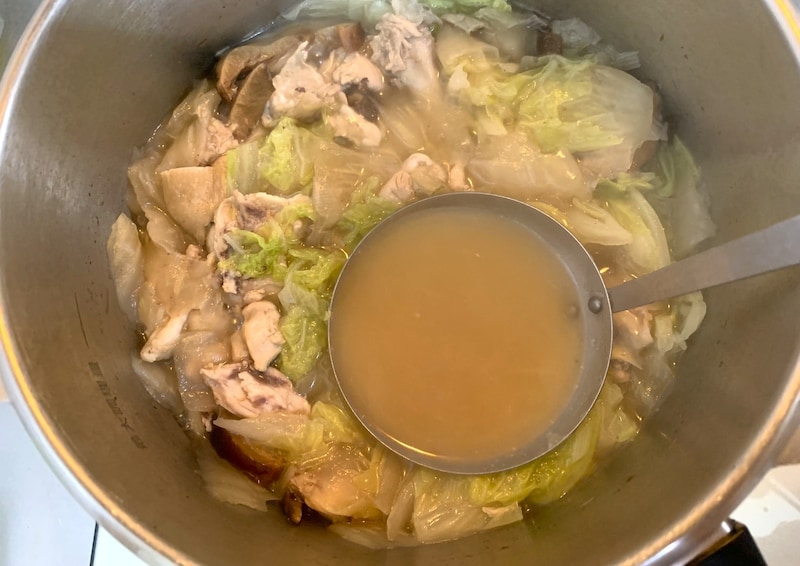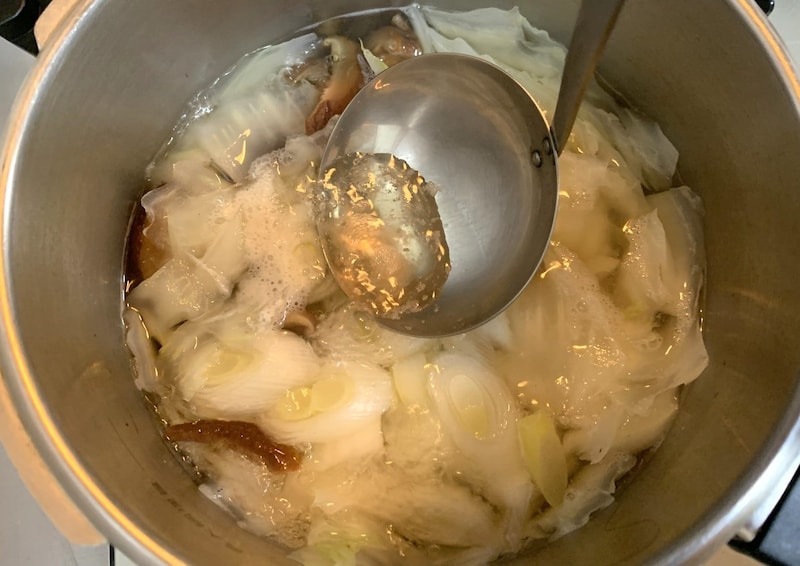 ③アクを取りつつ、白菜が透明になるまで煮続けます。