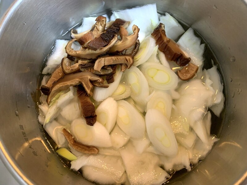②鍋に椎茸、ネギ、白菜の芯(まだ火が通りやすい葉は入れない。)と水300ccを鍋に入れて火にかけます。