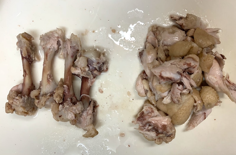 今回は鶏に火が通ったらほぐして、骨から身を外しました。骨付きのままだと個人的に食べづらいという理由で外しただけなので、この作業はなくて大丈夫です。