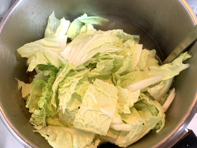 ⑤お肉に火が通ったら白菜の葉を入れます。