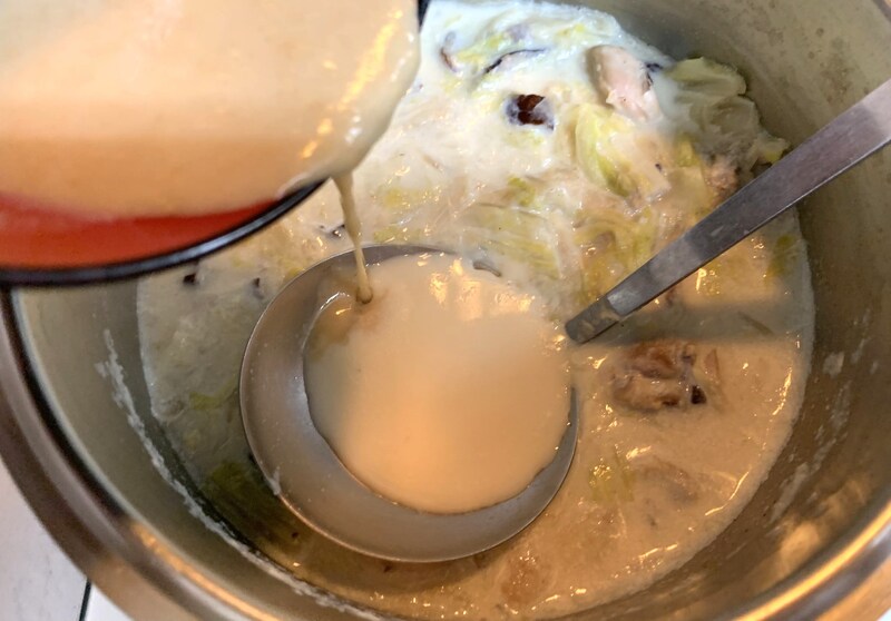 調味液を豆乳スープに戻します。味見をして味の濃い・薄いを整えたら完成です!
