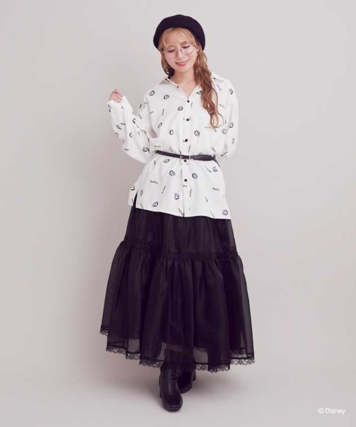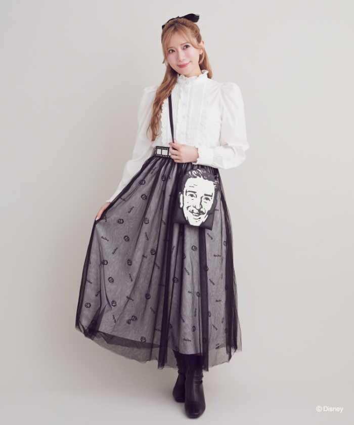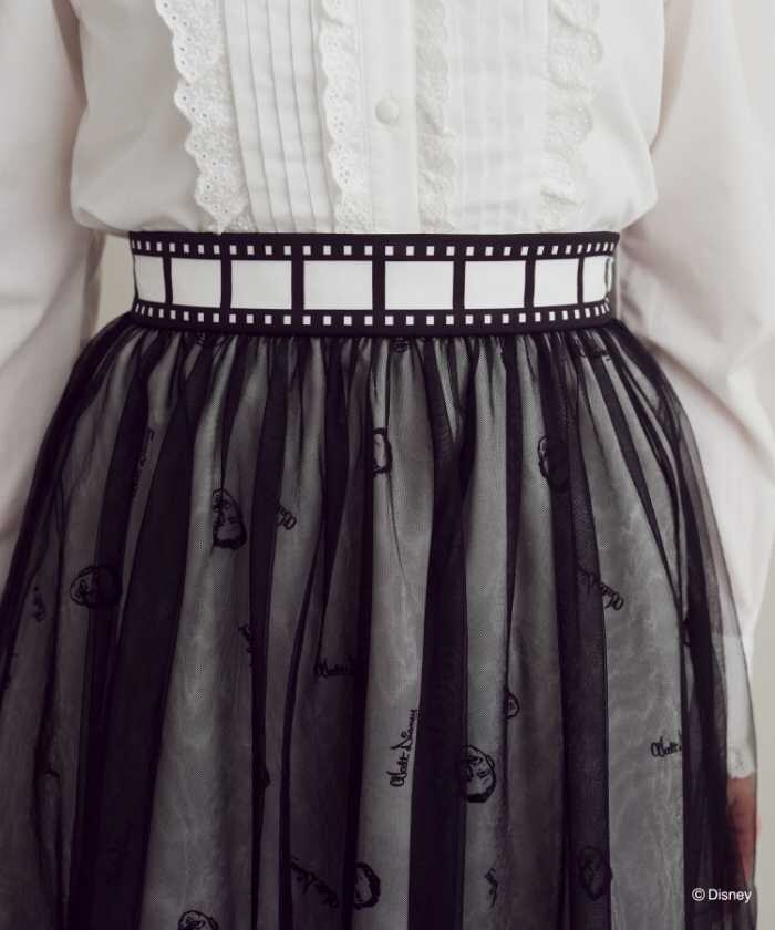 「ウォルト・ディズニー/総柄スカート」12,100円は、チュールを重ねた軽やかな印象で、ウエストには映画フィルムを思わせるディテールをプラス。