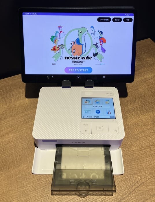 「ネッシーカフェ」ではコラボメニュー1品につき+300円で1枚のステッカーをランダムで出力し配布します。設置されたタブレットの画面で「START」ボタンをタップすると、「Apex Legends(TM)」の世界観を表現したランダム演出が再生され、その場で当たった1枚が「SELPHY CP1500」からプリントされます。ステッカーデザインは全28種で、第1弾と第2弾で入れ替わります。