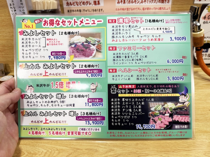 焼肉みよしには、数多くの焼肉メニューがあるだけでなく、一品料理も多彩。なにより、一人客向けに用意された「満喫セット」も存在する。しかも、ほとんどの肉が米沢牛だ。優しいうえに、味も絶品となれば、入らない理由はない。