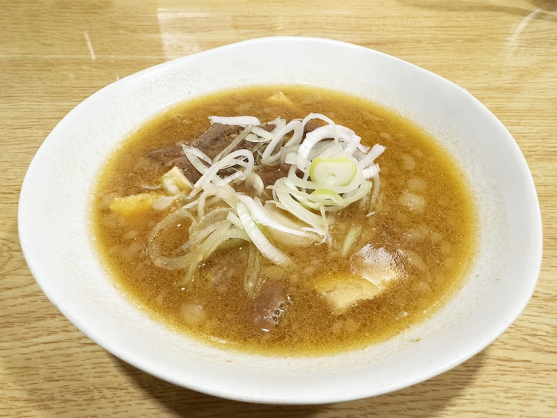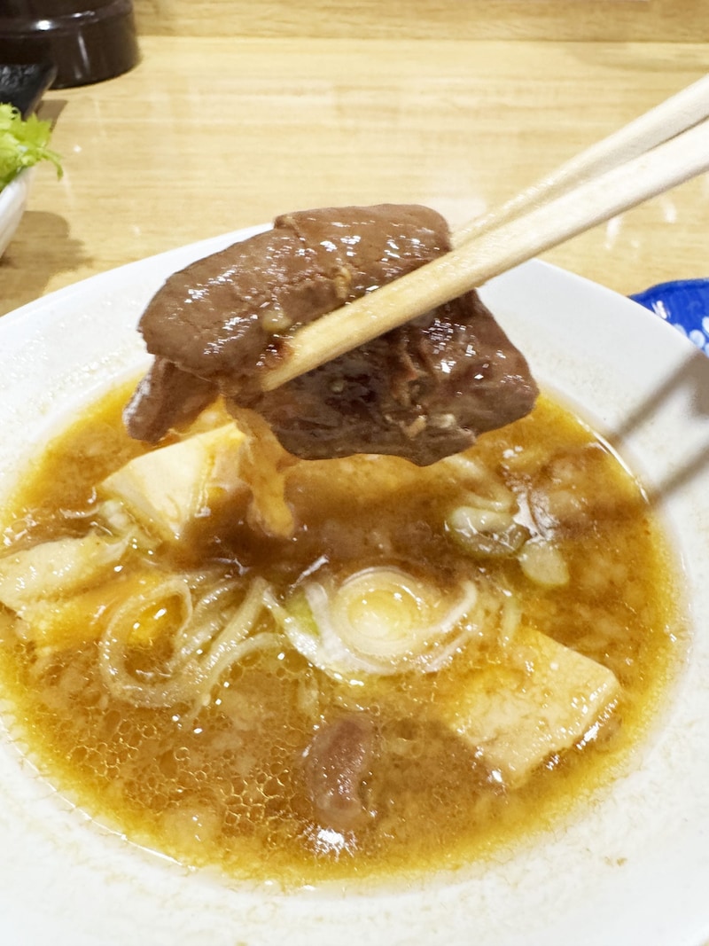 とにかく、薫りが芳醇。湯気とともに芳醇な薫りが漂う。箸でつまんでみると、そのモツの色に驚かされる。徹底的に、煮込みに煮込みまくられた、旨味たっぷりシミシミのモツだ。