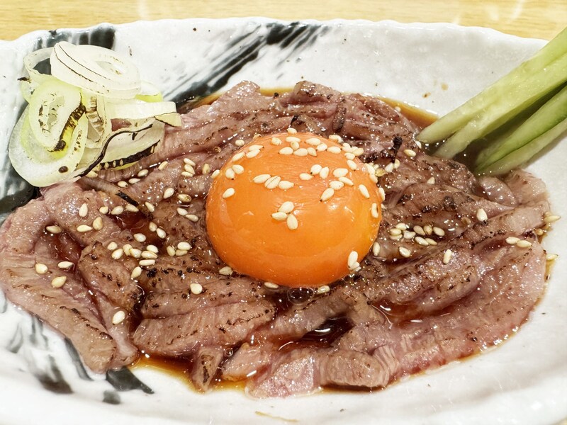 ただでさえユッケというだけで美味なのだが、これは米沢牛のユッケ。目の前にやってきた米沢牛ユッケは、しっかりと炙られて仕上げられていた。新鮮でおいしいだけでなく、安心安全ということか。