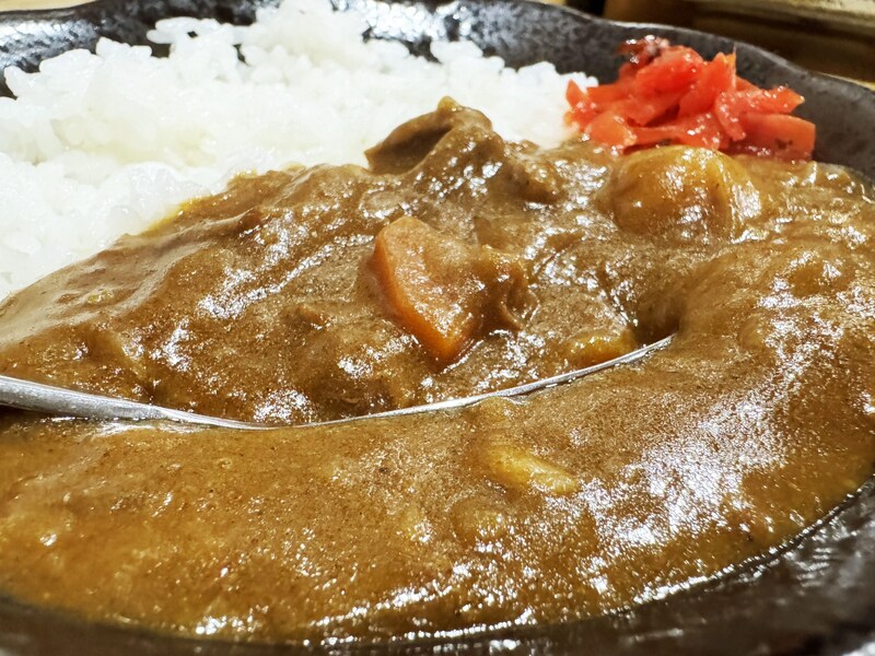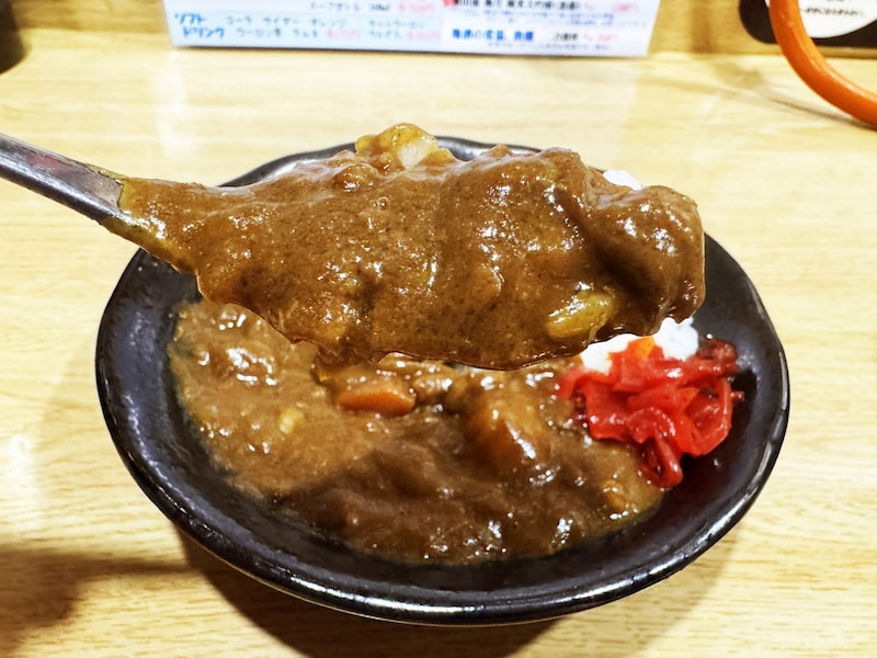 カレーをよく見てほしい。極めて粘性が強く、かなり濃密濃厚な密度のカレーに仕上がっている。極めてネットリとしたカレーをライスとともにスプーンですくう。密度が高いからなのか、けっこうズッシリとした重量を感じる。うまい、うますぎる。