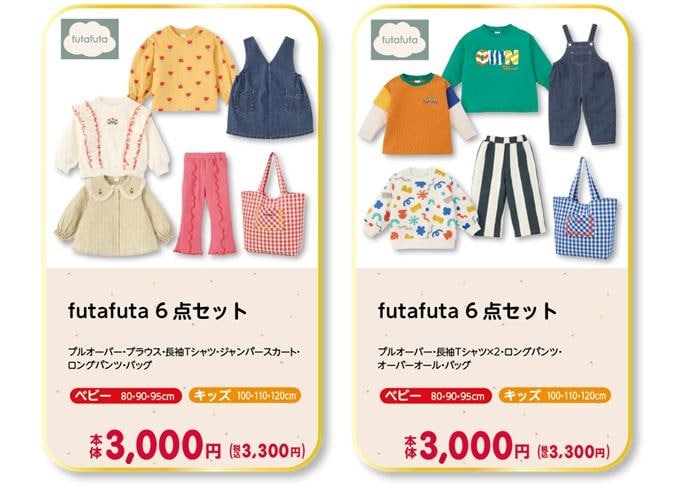 福袋2パターンあり、長袖トップス3点、ロングパンツ1点、ジャンパースカートまたはオーバーオール1点、バッグ1点の計6点セットです。