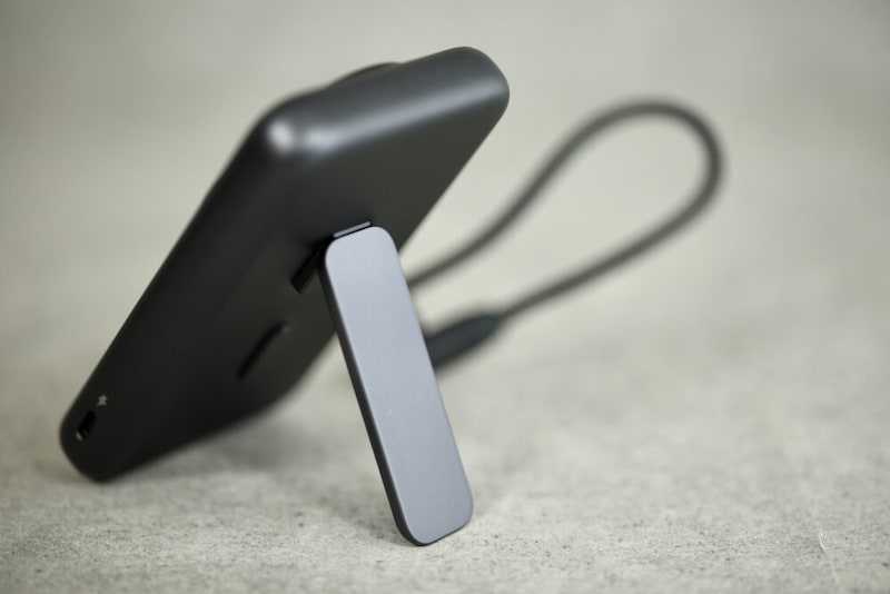 MagSafeと共通規格の磁石でiPhoneの本体に取り付けられる。ただし、非接触充電は行わない。ただ、XREALで映像を見るような重い処理をしている時にMagSafeを使って充電すると、iPhone本体のチップセットの発熱、iPhone内のバッテリーの発熱に非接触充電の発熱を加えてしまうことになるので、熱的にかなり厳しい。このMagSafeを使わずにケーブルで給電する仕様は正しいように思う。