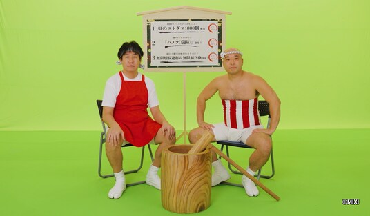 また「なぁ~」と叫び続ける小野まじめさんの後頭部に、ゲーム内アイテムの「虹のコトダマ」が貼られていたり、後頭部自体が途中で魚肉ソーセージになったり、はたまた小野まじめさんのそっくりさんに入れ替わるなど、ユニークな仕掛けが盛り込まれています。最後に、相方のせんちゃんさんが「にぃ~が欲しいよぉ~」と困り顔で呟き、監督からカットの声がかかり楽屋に戻りますが、それでも看板に釘付けで「なぁ~」と叫び続ける小野まじめさん。そんな様子を通して、ゲーム内で実施される年末年始イベントのめでたさをユーモラスに伝えています。