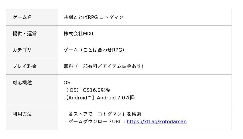 「共闘ことばRPG コトダマン」<https://kotodaman.jp/>は、スマートフォンで遊べる「ことば」を使った新感覚バトルRPGです。文字の精霊「コトダマン」を組み合わせてことばをつくり、その長さや種類に応じて攻撃が変化する独自のゲーム性が特徴です。最大4人で挑むマルチプレイでは、友人や家族と協力しながら、お互いの知識を持ち寄ってことばを生み出す楽しさが広がります。対応ワードは生き物、食べ物、地名、歴史上の人物からトレンドワードまで29万語以上。日々新たなことばが追加され、遊びの幅は無限に広がり続けています。「ことば」の面白さと、仲間との協力プレイが融合した、まったく新しい体験型エンターテインメントです。