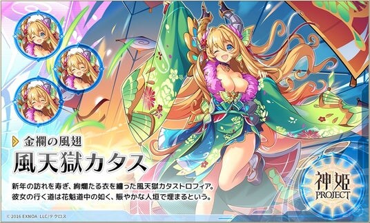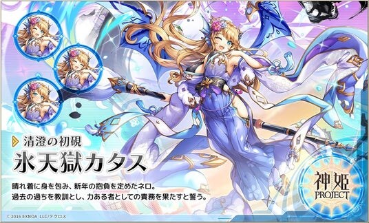 合同会社EXNOA(本社:東京都港区、CEO:東條 寛、URL:https://games.dmm.com/)が運営するDMM GAMESにおいて『神姫PROJECT』は、「風天獄カタス」「氷天獄カタス」「フィア」が新衣装で登場することを発表した。さらに毎日最高100連のルーレットガチャも開催中。