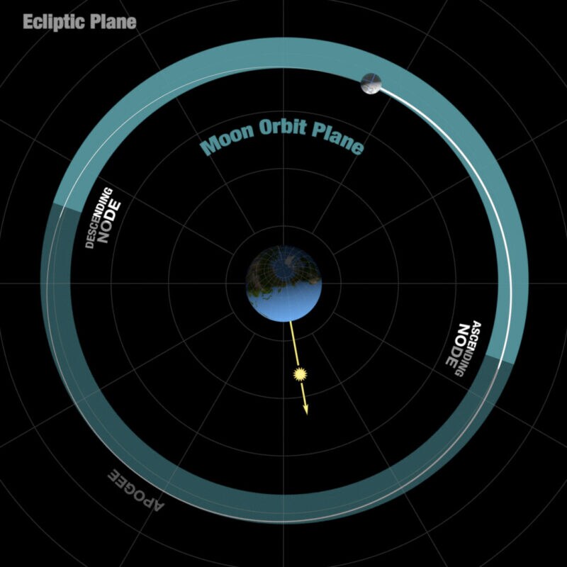 青緑色のリングは、地球から月までの距離の幅を示しています。また月の軌道は黄道面に対して約5度傾いており、リングの明るい色のところは黄道面より上にある部分です。「ASCENDING NODE」は昇交点、「DESCENDING NODE」は降交点です。
