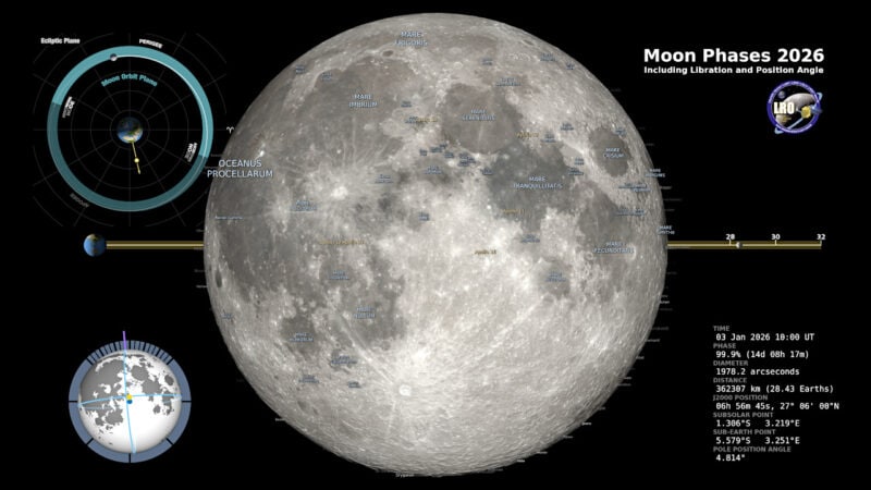 この映像は、2026年1月1日から12月31日までの月の満ち欠けを示したものです。1時間ごとの月の様子を示す画像をつなげて動画にしたもので、NASA's Scientific Visualization Studioから公開されました。