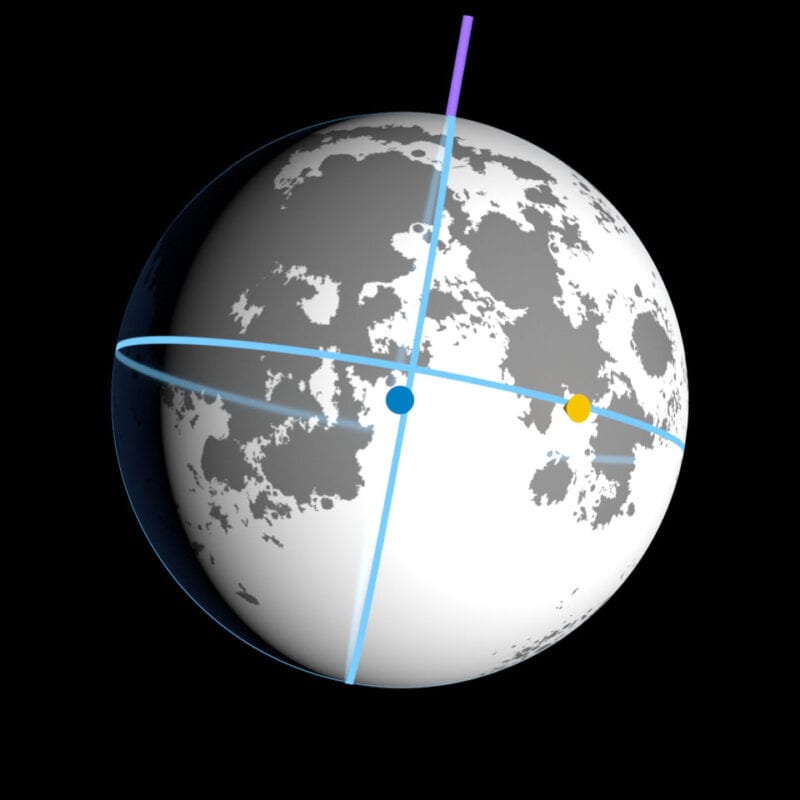 冒頭の映像の左下の図で、黄色い円錐は太陽が天頂にくる地点(太陽直下点)を示しています。一方、青い●は地球が天頂、つまり真上にくる地点を示しています。この青い●はまた、地球から見たときに月の円盤のちょうど中央に当たります。水色の円は赤道と子午線です。赤道や子午線に対して、青い印が上下左右に動きます。これは月の秤動を示しています。