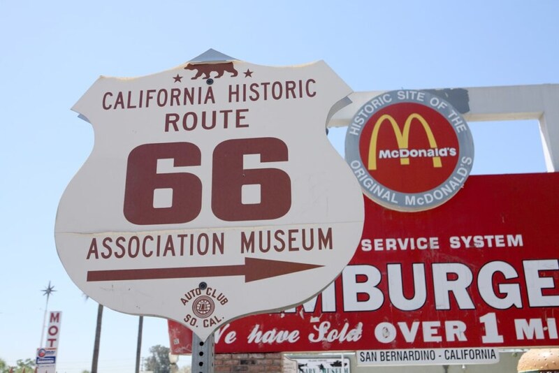 マクドナルド1号店は、現在は(撮影当時も)ハンバーガーショップとしての営業はしておらず、博物館となっている。中にはマクドナルドにちなんだおもちゃや食器などが展示されていた。外のマックの看板の前にはルート66のロードサインが。ここはルート66の旧道のすぐ近くにあるようだった。