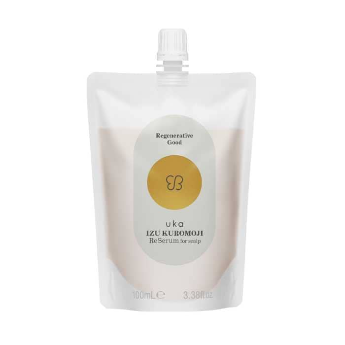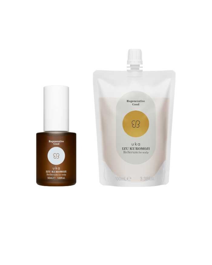 ラインアップは2種類。uka IZU KUROMOJI Re Serum for scalpは価格6,600円(税込)、容量50ml。スパウト付きリフィルは価格11,000円(税込)、容量100ml(スパウト付きリフィル)。