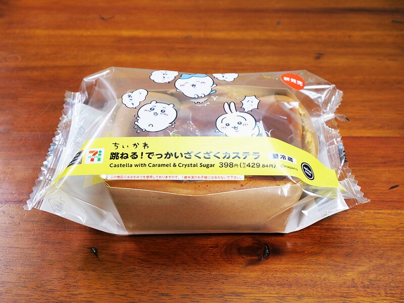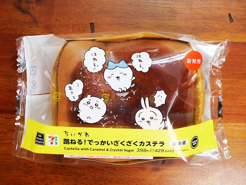 これ、あなどれないコラボグルメですよ。人気漫画「ちいかわ」(ナガノ先生)とセブンイレブンのコラボフードとして発売された「跳ねる! でっかいざくざくカステラ」なのですが、これかなりハンパない。