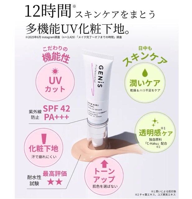 ・ジェル基材で毛穴や色ムラをカバーし、自然なツヤ・透明感を実現