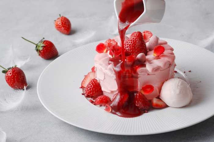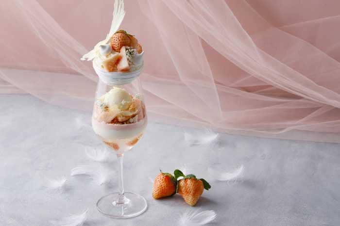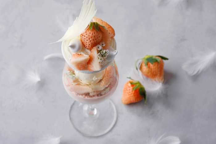 瑞々しい白いちごをメインに、クリームチーズアイスやエディブルフラワー、ホワイトチョコレートコポー、パールクラッカンが重なり合い、上品な味のレイヤーを実現。