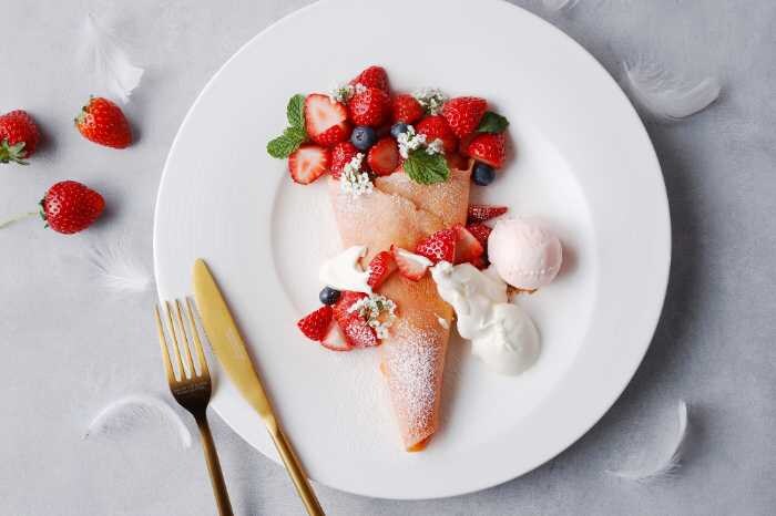 期間限定でオプション提供される「いちごクレープシュゼット」は、香り高いクレープ生地にサワークリーム、オレンジコンフィチュール、練乳、いちご、ホワイトチョコレートクランチ、シャンティを包み込んだ華やかな逸品。