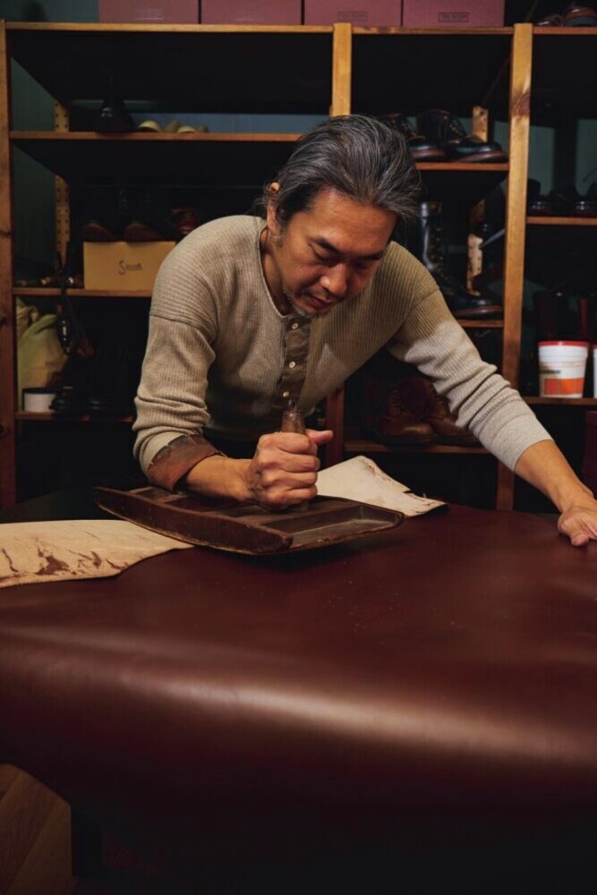 ヴィンテージのシボ革に魅せられたSKOOB代表・笹野氏が辿り着いたのは、当時と同じ手法である“手揉み”だった。実際に専用として使われていた旧い器具を知人の革卸業者から譲り受け、笹野氏自らその手でレザーを揉み、理想に近いシボを施していく。このような手間も時間もかかる製法は、言うまでもなく現代ではほぼ用いられていない。