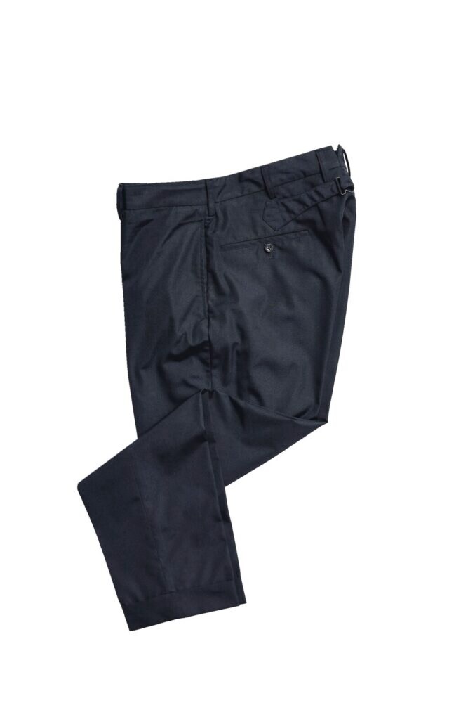 生地の選択や体型に合わせたパターンオーダーが可能なアナトミカのスーツ。寺本さんは、あえて化繊の入ったテトロンコットンでブラックスーツをオーダーしている。ベーシックな段返りの3つボタンで、パンツはバックルバック仕様。