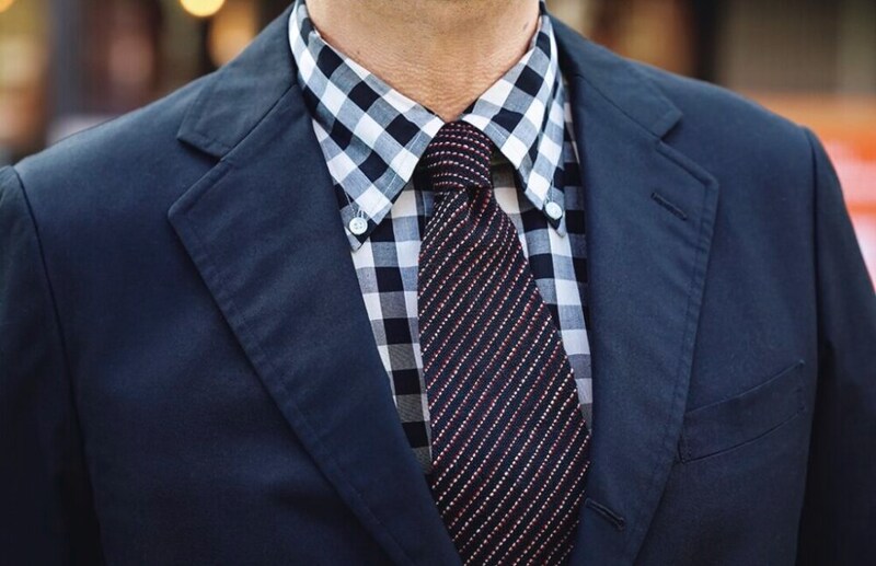 スーツスタイルの決め手であるVゾーンに遊び心を入れるのも大事なポイント。この日はブラック×ベージュのチェックシャツを合わせ、タイはアメリカのハンドウーブンのウールタイをセレクト。あえてドレス的なものとは一線を画した。