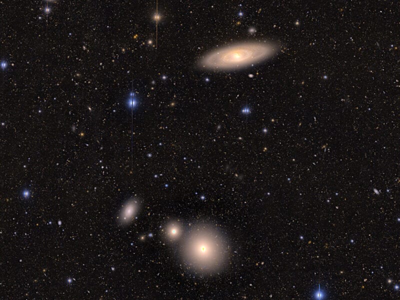 画像上部にあるのがNGC 4274で、リング状にも見える渦状腕があるのがわかります。画像下部には右からNGC 4278、NGC 4283、NGC 4286という3つの銀河が並んで映っています。これらの銀河はNGC 4274を中心に「かみのけ座 I 銀河群」を形成していると考えられています。この銀河群は、画像に映っていないものも含めて、明るい銀河が10個以上集まる小規模な銀河集団とのことです。地球からの距離は4400万光年。