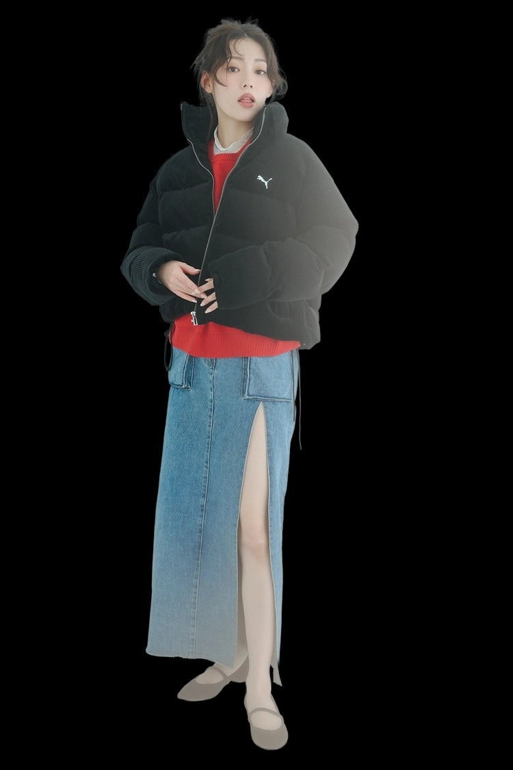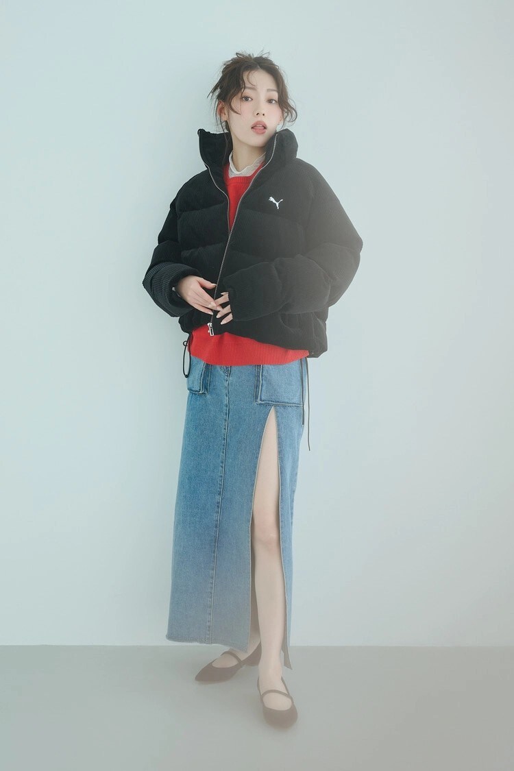 コーデュロイジャケット 22,000円/プーマ 赤ニット 2,790円/神戸レタス 白チュールトップス 6,490円/LILLIAN CARAT(リリアン カラット)スリットデニムスカート 17,710円/THREE TO EIGHTY(HANA KOREA)パンプス 18,150円/ダイアナ(ダイアナ 銀座本店)