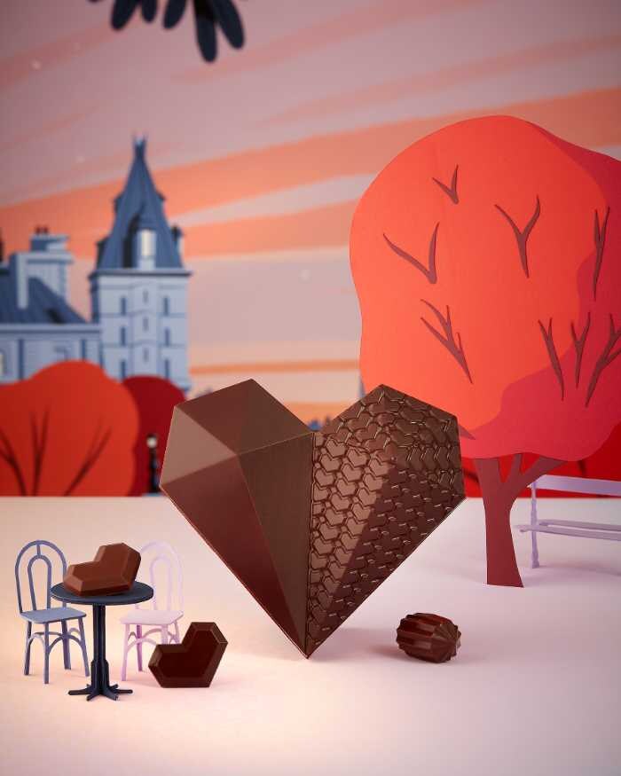 「アンフィニ・クール」(6,480円)は、大きなハート型ショコラの中に、香ばしいカカオニブプラリネを忍ばせたカカオポッドや、幾何学デザインが印象的なハートショコラ ノワール&オ・レが隠れた特別な一品です。