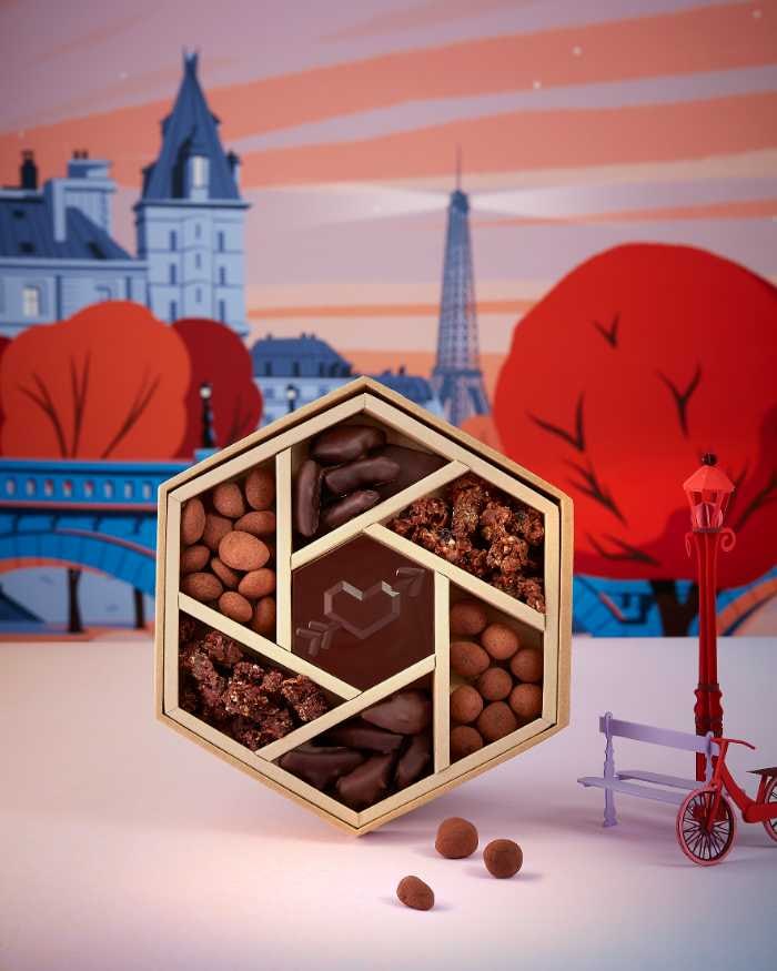 さらに六角形ボックスが美しい「コフレ・レ・アンコントルナーブル エディション・クール」(9,720円)は、ドライフルーツ、ナッツ、クレープ生地などを使った7種のショコラを詰め合わせ、特別感あふれる一箱です。
