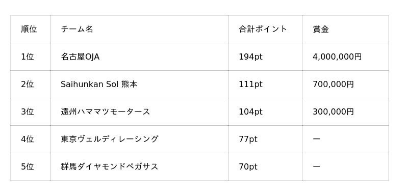 1位の名古屋OJAは2位の遠州ハママツモータースに83ポイント差、個人チャンピオン武藤壮汰選手は2位の小出峻選手(名古屋OJA)に30ポイント差での優勝。1位の名古屋OJAには賞金として4,000,000円、個人チャンピオン武藤選手には500,000円が贈呈されました。また、2位および3位のチームにもそれぞれ賞金が授与されました。
