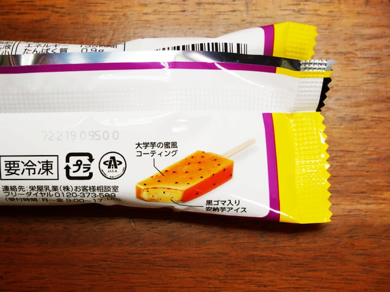 「大学芋の味・食感をイメージした、安納芋ペースト使用のバーアイスです。黒ゴマ入りのねっとり食感の芋アイスを、甘じょっぱい大学芋の蜜風コーティングで包みました」