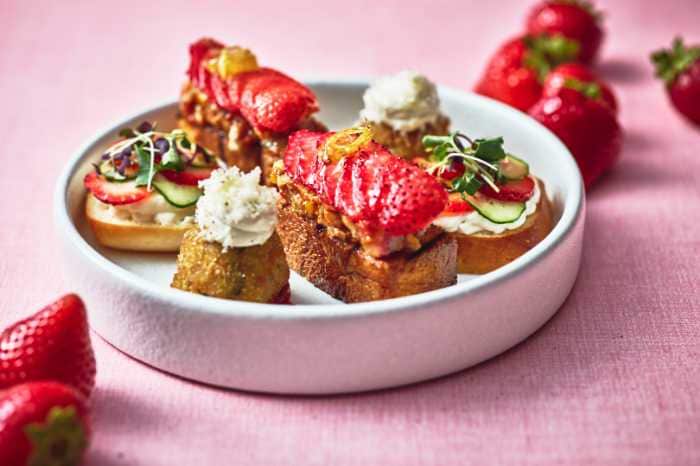 セイボリーには、イタリアンアレンジが光る「ストロベリーとチーズ、黒胡椒のアランチーニ」「ストロベリーとトマトのサラダチーズパンナコッタ添え」「ストロベリーと鴨のカッチャトーラブルスケッタ」を用意。