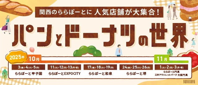 全国の人気ベーカリーとドーナツショップが参加する「パンとドーナツの世界」。2025年10月3日(金)を皮切りに、関西のららぽーと5施設を巡ります。