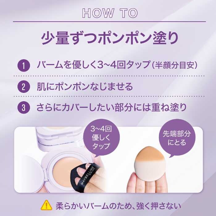 使い方はとても簡単。バームを3〜4回やさしくタップし、ポンポンとのせるだけで自然な美肌へ。