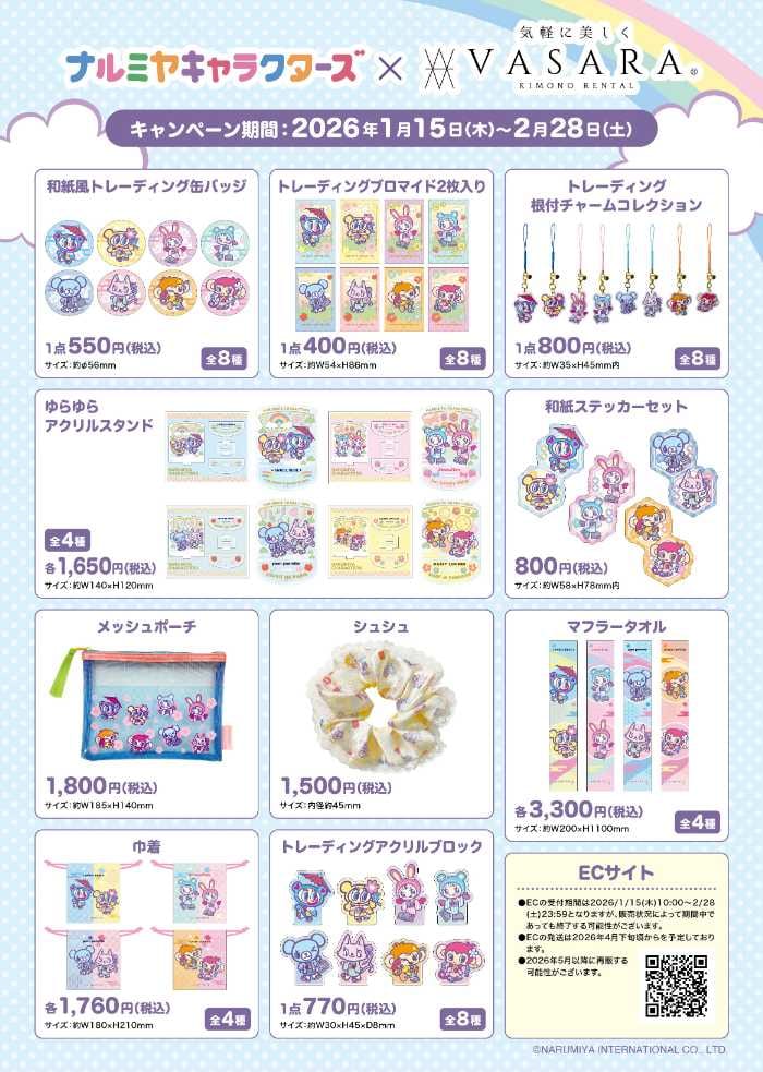 平成の女の子文化を彩った“ナルミヤキャラクターズ”が、全国で着物レンタルを展開するVASARAとコラボレーション。2026年1月15日(木)〜2月28日(土)の期間限定で、当時を知る大人女子にも、今のトレンド好きさんにも響く特別なキャンペーンがスタートします。人気ブランドキャラクターたちが着物姿の描き下ろしイラストで登場し、ここでしか手に入らない限定レンタルプランやグッズも満載♡街歩きがもっと楽しくなる、ときめきあふれるイベントです。