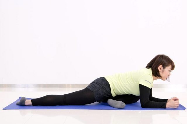 (2)上半身を前に倒して床にひじを着き、ゆっくり息を吐きながら30秒間キープする