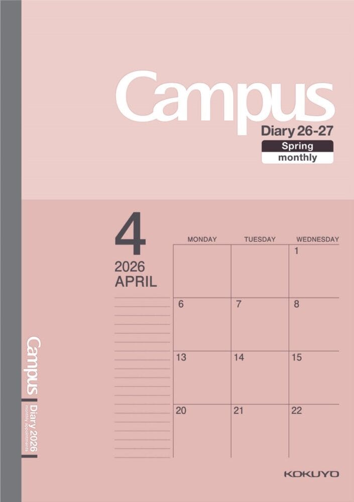 コクヨ株式会社は、キャンパスノートと同じコクヨオリジナル原紙を使用したシンプルな手帳「キャンパスダイアリー」シリーズより、マンスリー・スタンダードタイプの4月始まり版を、2026年1月中旬より順次発売する。