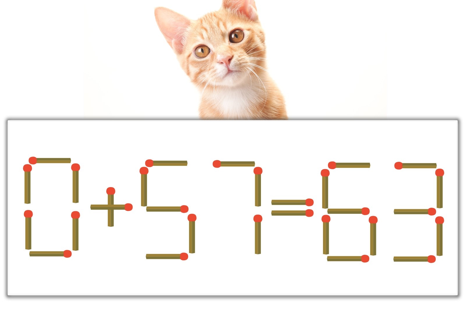 「0」のマッチ棒を1本、左下にスライドさせて「6」を作り、「6+57=63」にする。※解答は複数ある場合があります。