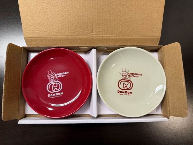 ドムドムハンバーガーとコメダ珈琲のロゴが入った直径12センチほどのペアプレート。
