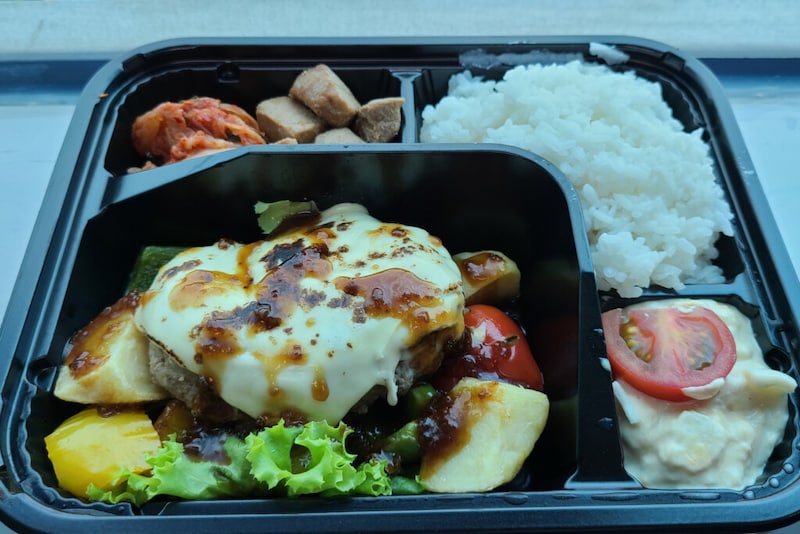チーズハンバーグデミグラスソース、チキンとロールキャベツのクリーム煮、フライドポテト。