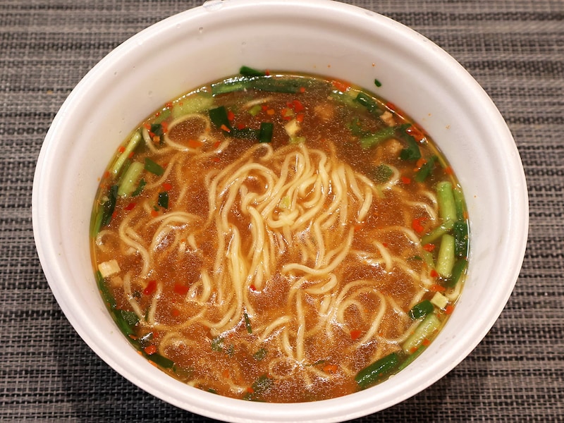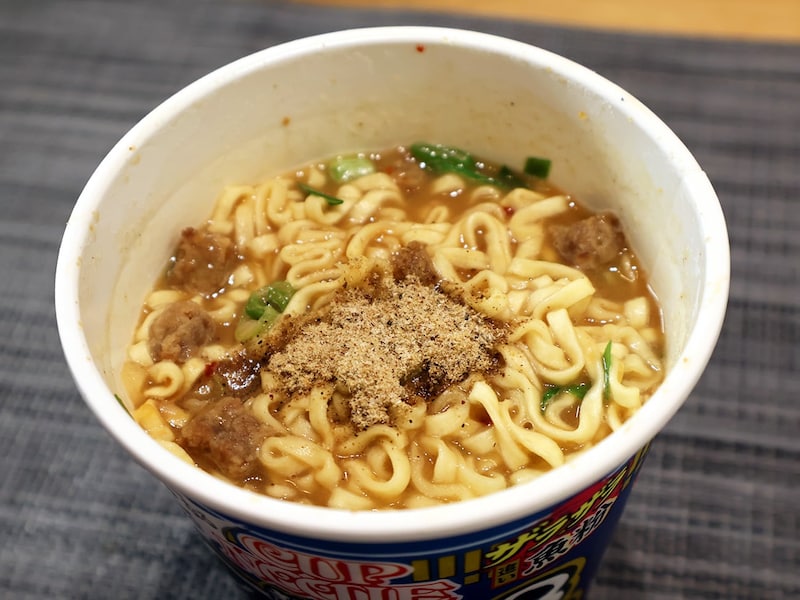 カップヌードルは平打ち麺なので、ただでさえ麺とスープが絡みやすいのですが、スープにとろみもあるのでいつも以上にどっぷり絡みます。ものすごい一体感!