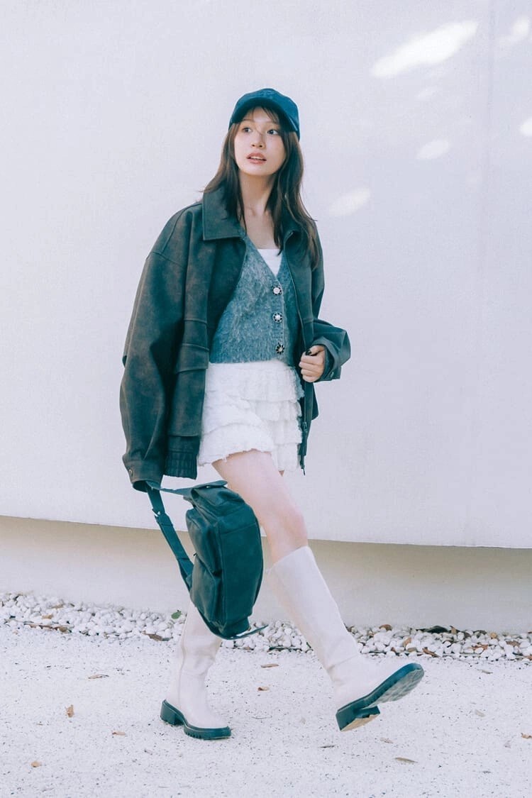 ティアードミニスカートは着回し。レザーブルゾン 6,599円/WEGO ニットカーディガン(ニットカーディガンとビスチエのセット)23,980円/LILY BROWN ティアードミニスカート 9,640円/CRANK(HANA SHOWROOM)キャップ 9,900円/OVERRIDE(OVERRIDE 神宮前)バッグ 3,629円/WEGO ロングブーツ 19,910円/RANDA インナー/スタイリスト私物